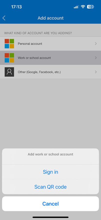 - Click on the + sign in the top right corner of the screen, Select Work or School account, then Scan QR Code and scan the code shown on the screen.